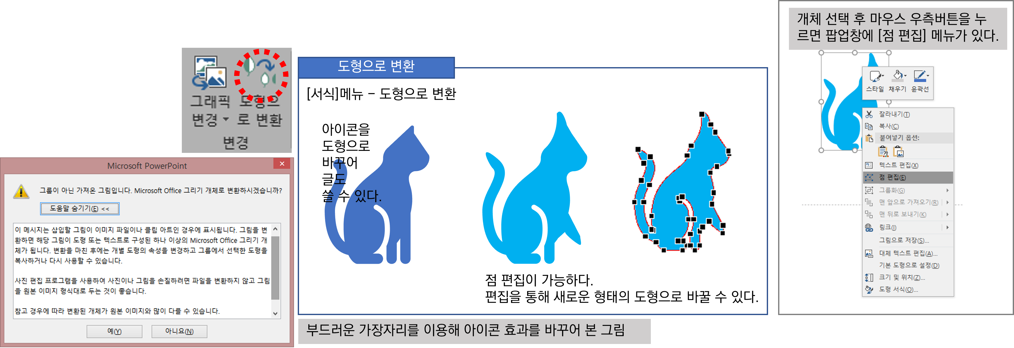 - 아이콘 선택 후 [그래픽 도구] - [서식]메뉴 – 도형으로 변환